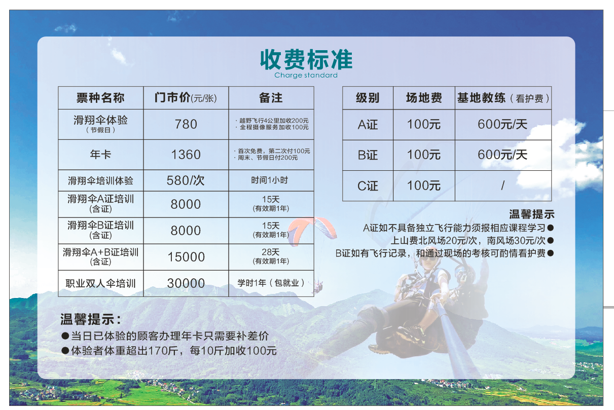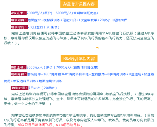 注:以上费用包含理论教材、培训全套器材、办证费、教练费、兰州市内交通费。除参加双人伞预备飞行员培训的其他所有人员,在小坡飞行及大山飞行阶段必须使用自己的飞行装备,如因个人经济原因无法配备,则可以会员身份租用俱乐部合格的飞行装备进行飞行。兰州市以外产生的训练费用及食宿、交通费用均采用AA制度。
